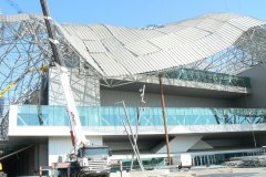 Opera di carpenteria metallica a Milano composta da struttura portante di tipologia spaziale non regolare in tubolare e sfere. Una copertura in lamiera tipo Kalzip in Omega, intradosso estradosso e con spessori dedicati completa la struttura.
